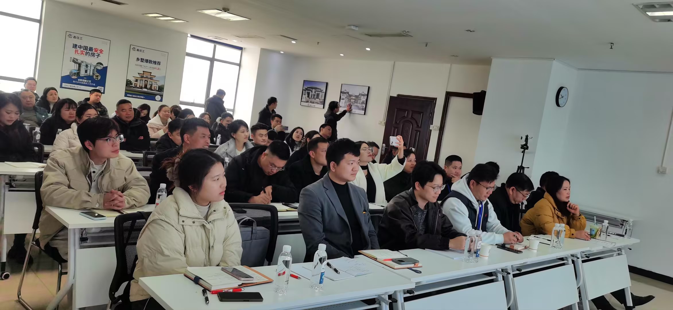 在理论学习环节,鑫住工的专业讲师围绕乡墅产品定位、客户需求挖掘、标准化施工管理等核心内容展开系统讲解。团队成员端坐课堂,或凝神思考乡墅行业的发展趋势,或专注记录产品设计与运营的关键要点,在沉浸式学习中吸收标杆企业的实战经验。