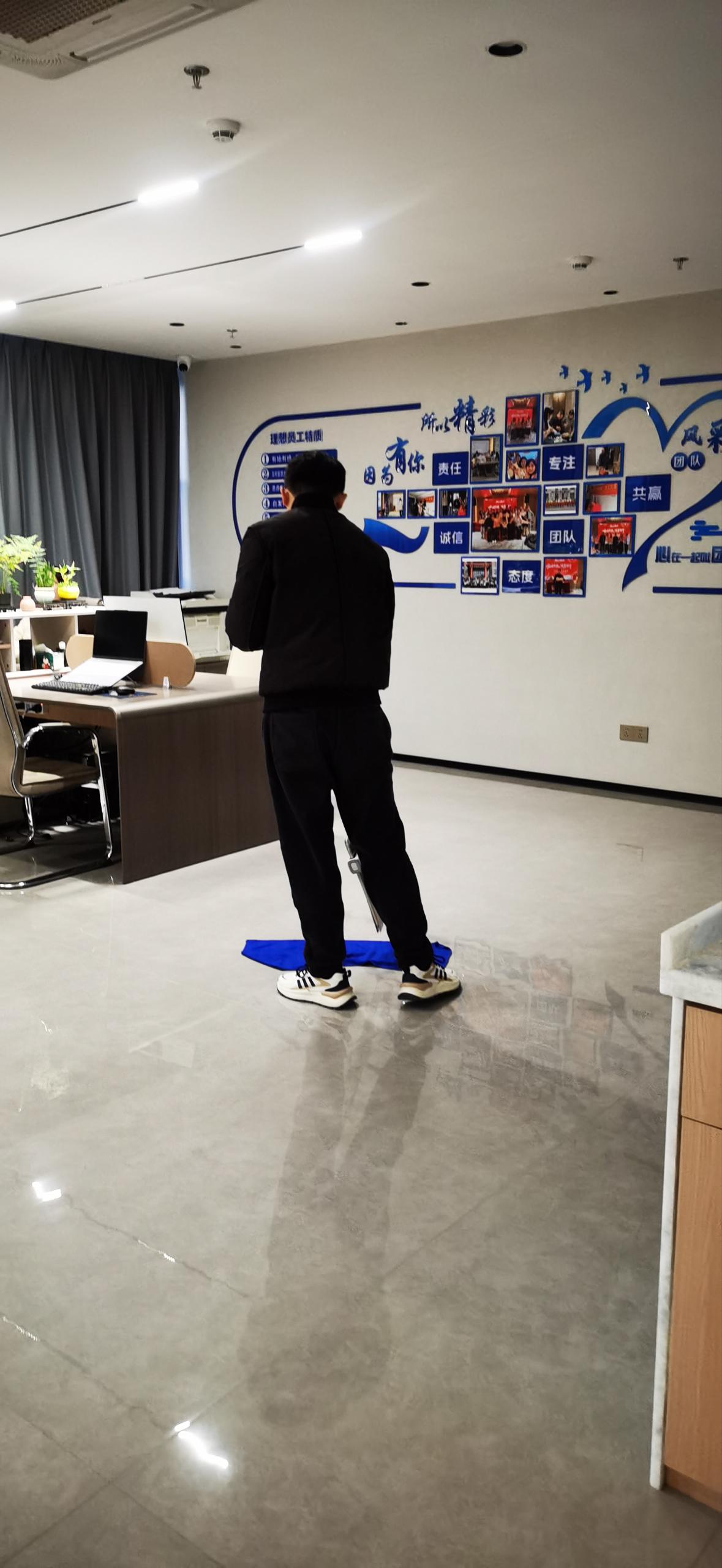 工位角落的扫帚挥起,连椅子腿都被擦得发亮;文化墙下的地砖,在蓝色抹布的擦拭下渐渐反光;茶水间的设备也被仔细打理干净——今天的艺洲办公室,是全员动手的“整洁现场”。